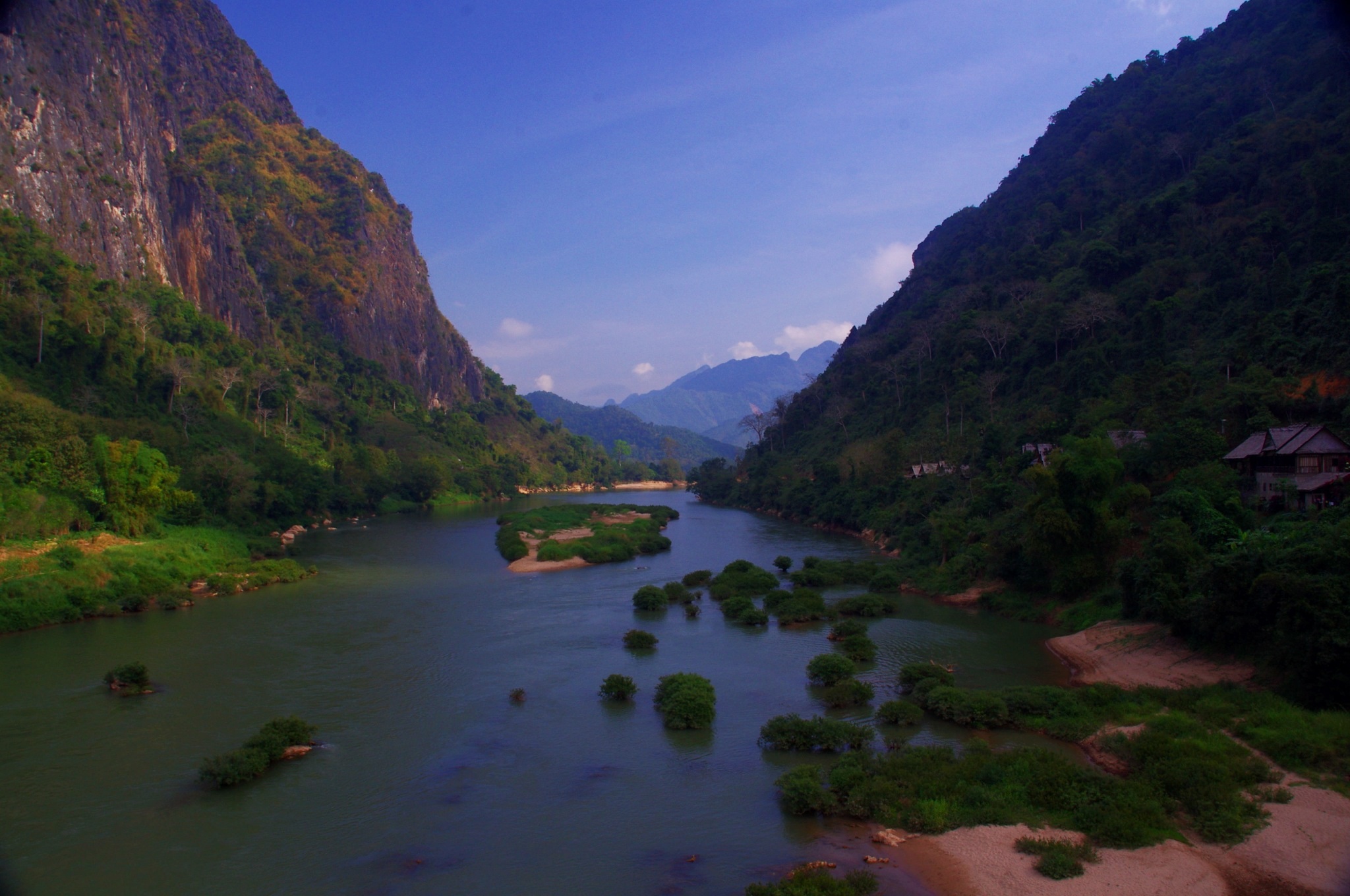 Ein Blick von der Brücke in Nong Khiaw flußaufwärts Richtung Muang Ngoi Neua