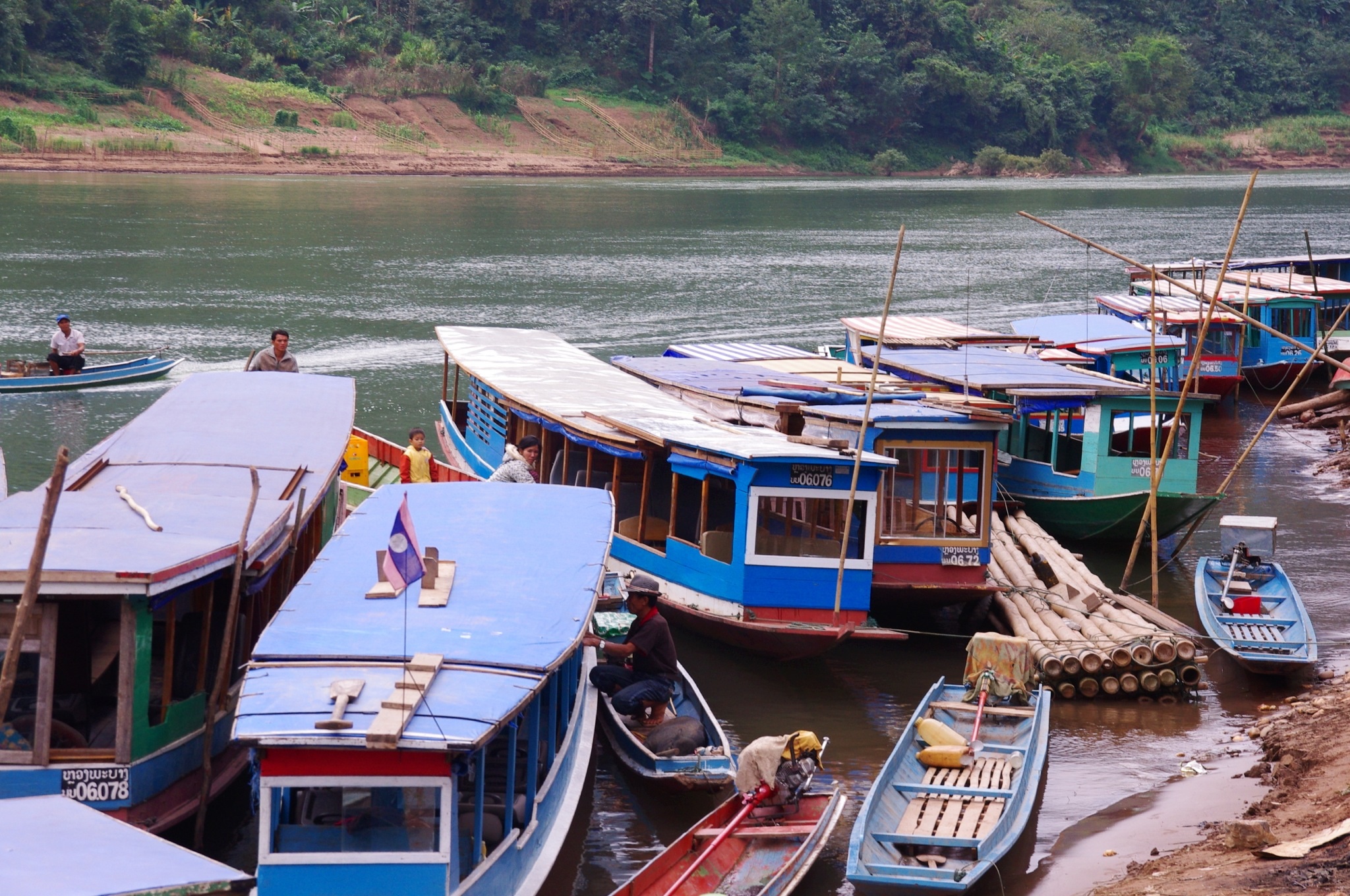 Nong Khiaw: Die Boote warten im Hafen darauf die Passagiere entweder nach Muang Ngoi Neua oder Luang Prabang zu bringen. Wir fahren Richtung Norden nach Muang Ngoi Neua.