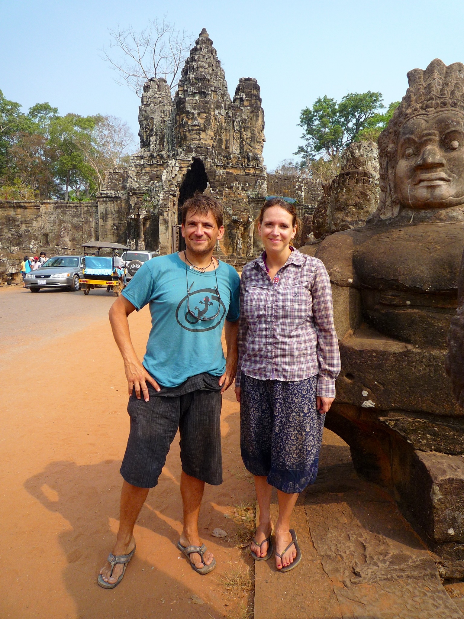 Unsere letzte kostenfreie Fahrt durch die Tempelanlage mit dem NGO-Ausweis zur Schule. Da muss nochmal ein Erinnerungsbild vor dem Tor von Ankor Thom geschossen werden.