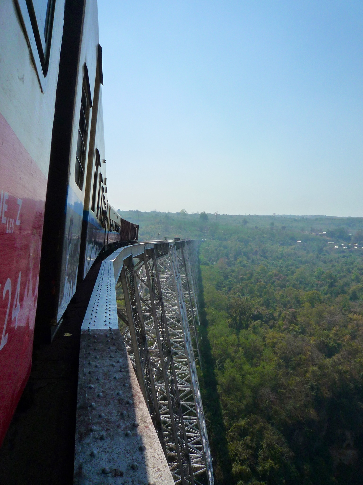 Gokteik viaduct: Von hier oben hat man einen tollen Ausblick und man vergisst beinahe, dass der Zug und die Schienen ihre besten Tage schon hinter sich haben. Erst am Ende der Brücke kommen Themen wie Wartung und Instandhaltung wieder problemlos über die Lippen.