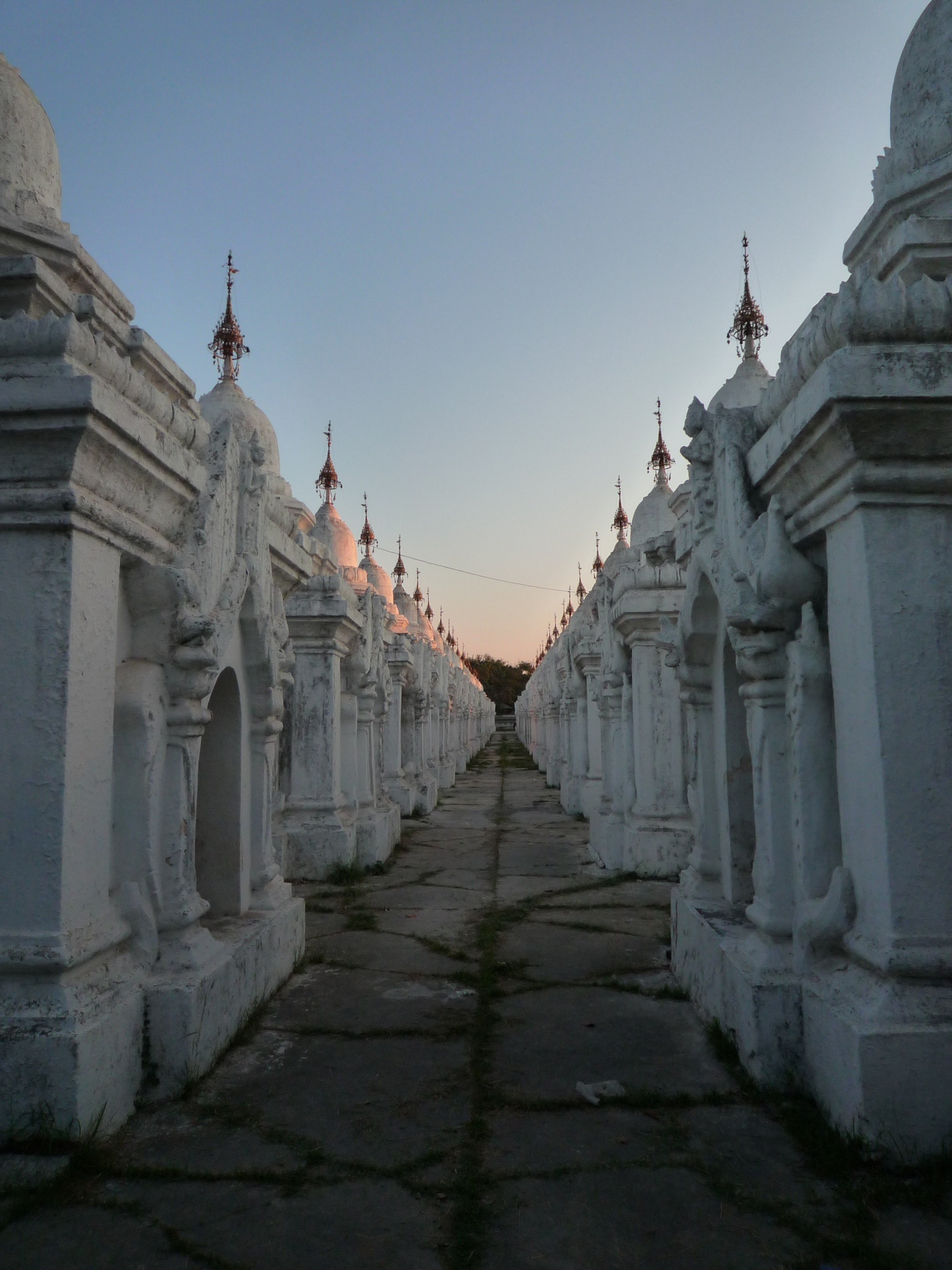 Mandalay: An der Kuthodaw-Pagode findet man das größte Buch der Welt. Aufgestellt in 729 kleinen Stupas befinden sich die einzelnen Seiten in Form von Steintafeln auf dem gesamten Gelände verteilt.