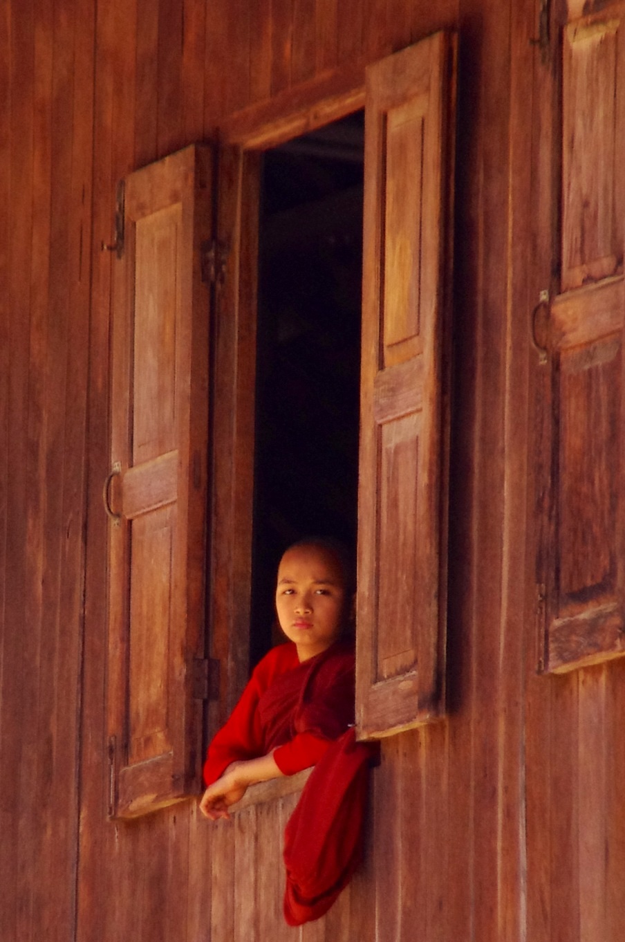 Hsipaw: Ein junger Mönch schaut aus dem Fenster des Teak-Klosters mit dem Bambus-Buddha.
