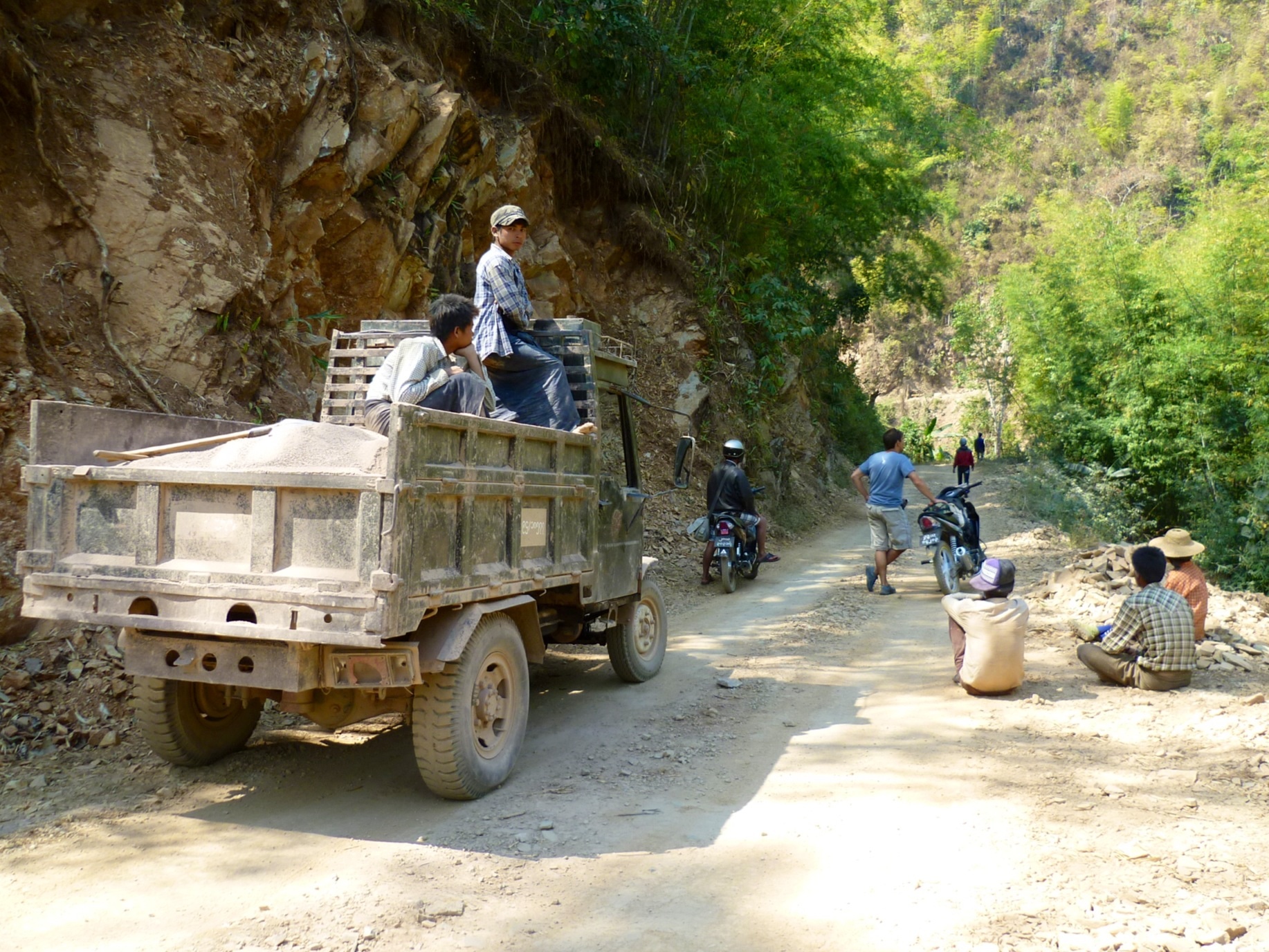 Namshan: Zum Glück werden wir rechtzeitig gewarnt, dass hinter der Kurve Sprengungen durchgeführt werden, sonst wären wir glatt weiter gefahren. Eine Minute später wackelt auch schon der Boden und Steine fliegen durch die Luft.