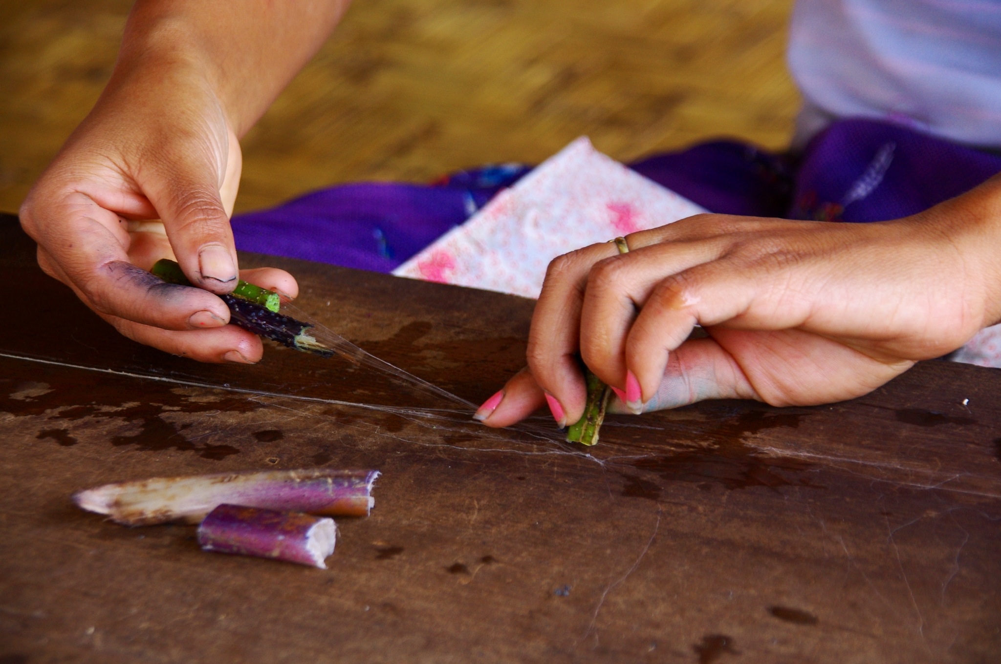 image Inle-See: Das ist der Grund, warum Bekleidung aus Lotus etwas teurer ist. Hier wird gezeigt, wie die Fasern mühsam aus den Stengeln gewonnen werden.