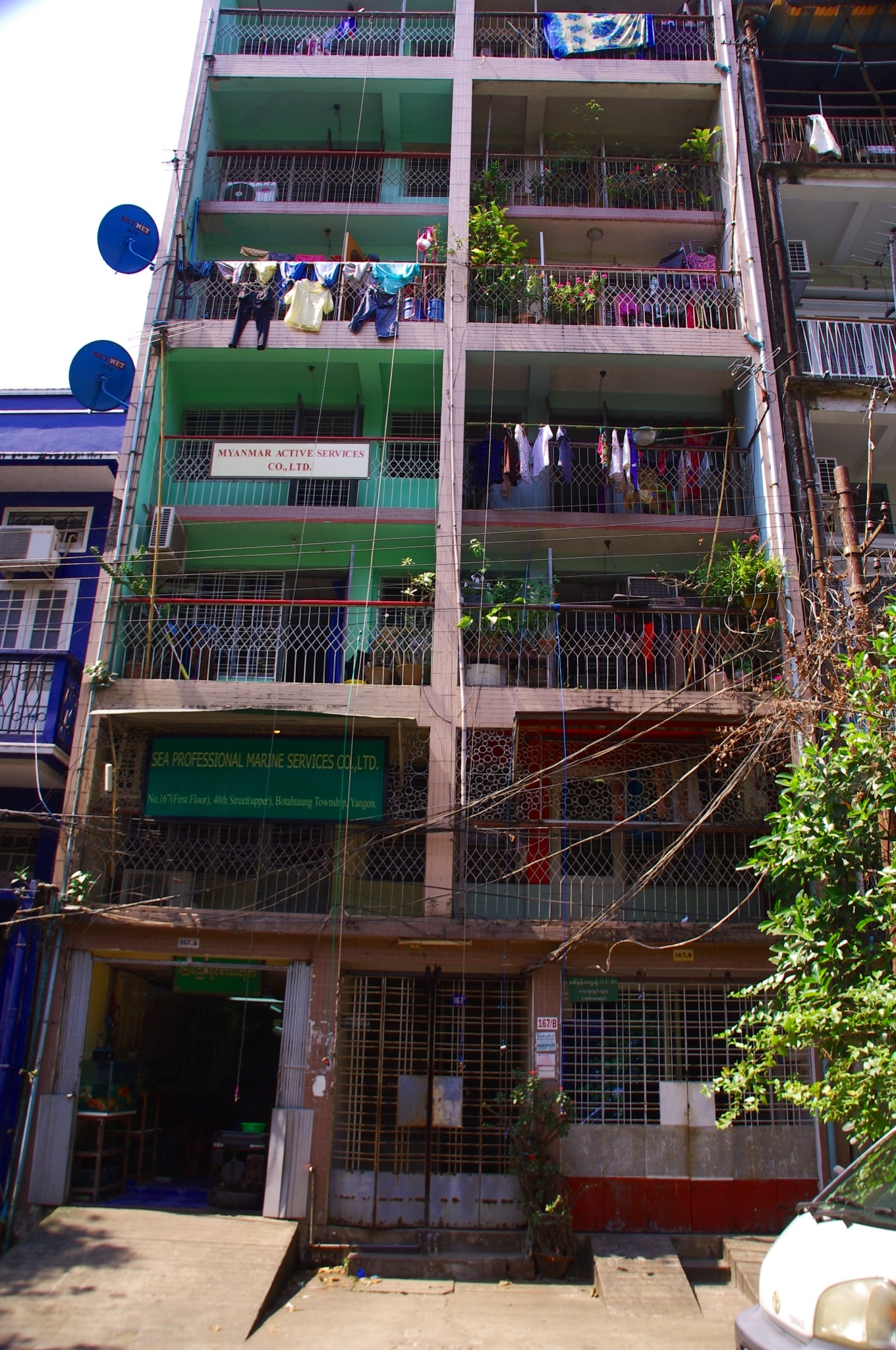 Yangon: Jeder Bewohner eines Hauses hat seine eigene Leine mit einer Klammer vom Balkon runterhängen. Post, Mitteilungen, aber auch die Einkäufe werden so in die Wohnungen herauf gezogen.