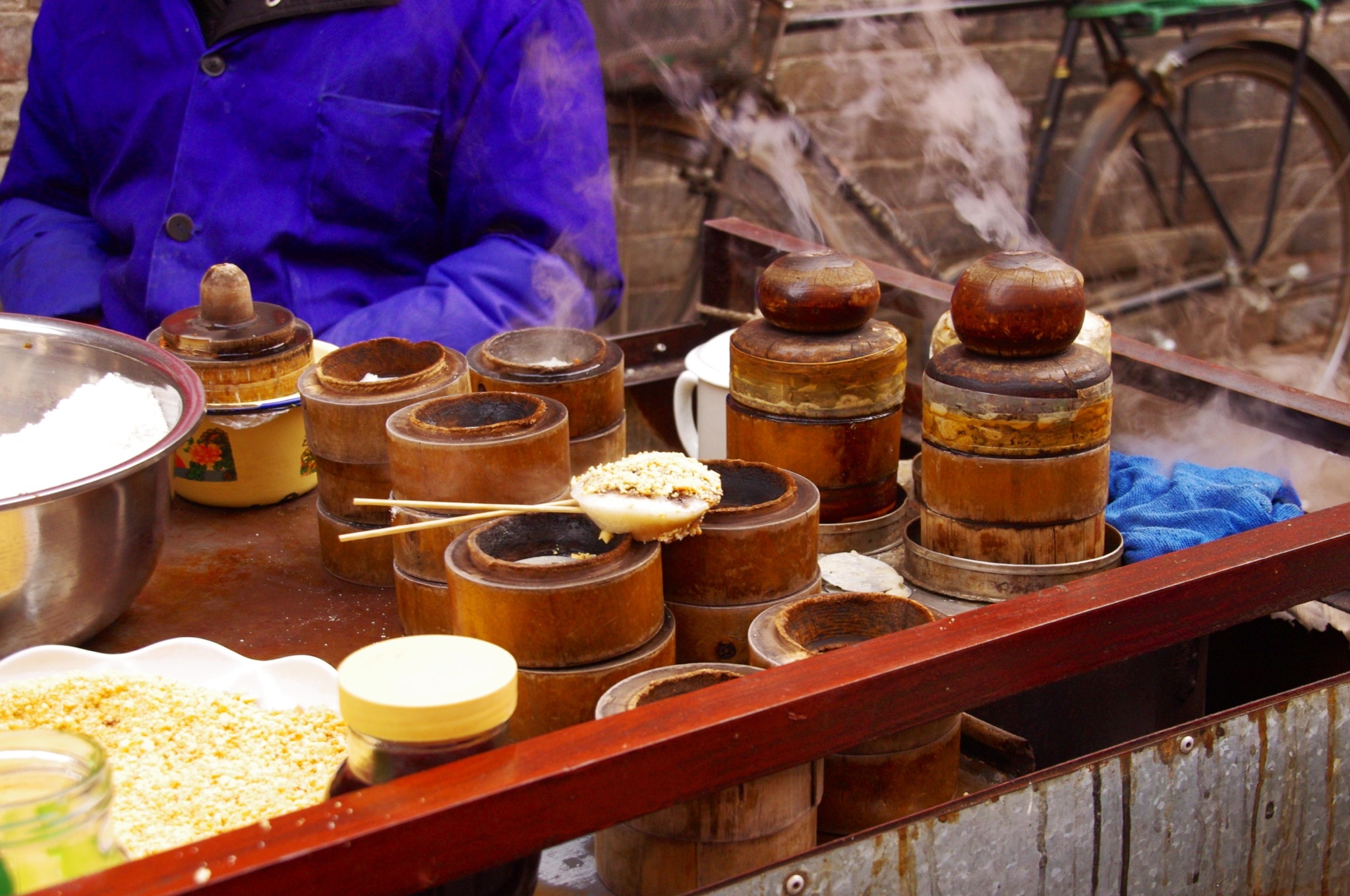 Xian: Bei Temperaturen um den Gefrierpunkt kommen die Reis-Steamer besonders gut zu Geltung. Mit reichlich Honig, Zucker, Rosenwasser und Sesamöl ein köstliches Hüftgold.